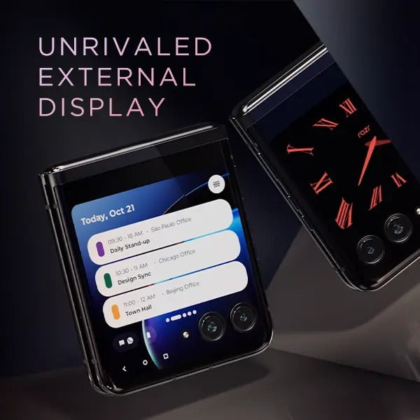 The Motorola Razr+ (2024) redefines the foldable smartphone experience with a bold fusion of retro design and modern innovation. With its iconic clamshell form factor, the Razr+ pays homage to Motorola's classic flip phones, while introducing major enhancements in usability and performance. One of the standout features is the expansive 4.0-inch external OLED display, the largest on any flip-style foldable, which allows users to run full apps, reply to messages, control music, and take selfies—all without opening the phone.